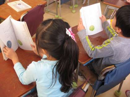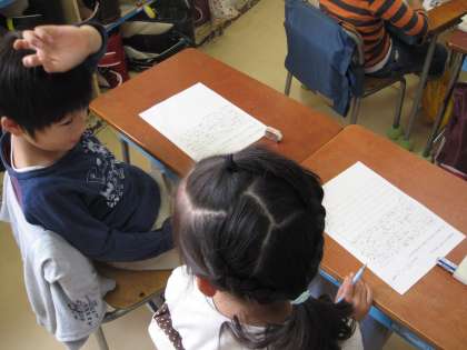 「小さい秋みつけた」を繰り返し音読した後に,メロディーにのせて音読しました。いつの間にか暗唱できるようになっている子がいました。秋を感じる言葉を集め,ワークシートに書きました。隣の友達と仲良く交流している姿は微笑ましかったです。