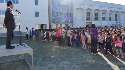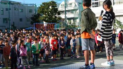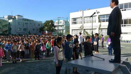 10日朝会は校庭で行いました。先週の小学生海外派遣の引率から帰ってきて、1週間ぶりの校長講話となりました。海外派遣の報告は来週の朝会で、本校代表児童と一緒に詳しく行うことを伝え、今日は、1つだけオーストリアの小学生のすてきなところを話しました。それは、笑顔です。二子の子どもたちの笑顔もすてきですが、あいさつするときは相手の顔を見て笑顔であいさつするしつけをされているオーストラリア、ウィーンの子どもたちはもっとすてきでした。日本人特有の控えめな態度も美徳だと思いますが、グローバル化にむかって、これはこれから大事だと思います。その後、代表委員からも、あいさつ運動の成果と課題について話があり、もっとあいさつを自分からしてほしいという、呼びかけがありました。通じるものがありますね。