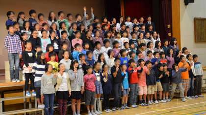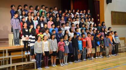 12日(水)、学芸会の劇の練習の後で、6年生が卒業アルバムに載せる予定の学年集合写真を舞台の前で撮りました。1枚目はおすましで、次はポーズをとって満面の笑みの写真が撮れました。