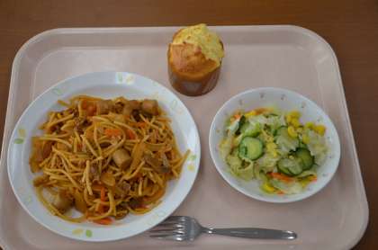 スパゲッティナポリタン 牛乳 コーンサラダ りんごマフィン