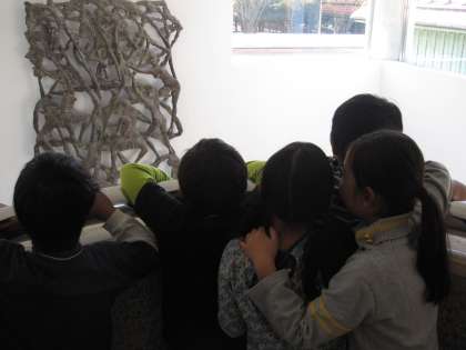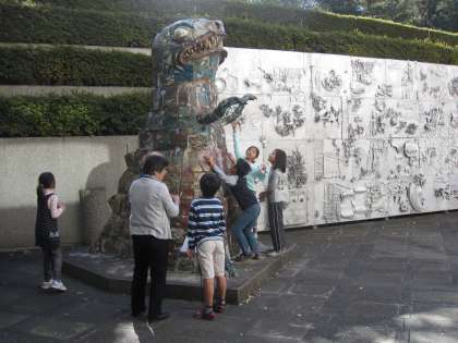 美術館のいたる所にアートが…!子どもたちは,発見するたびに熱心に鑑賞していました。「恐竜」は,昭和60年に小学校2・3年生が制作したものです。