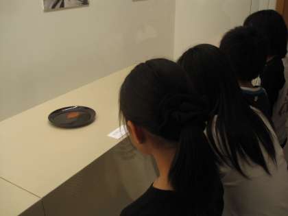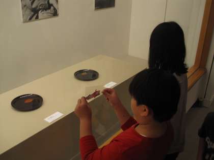 4年生の子どもたちは,2週間程前に,美術鑑賞教室の事前授業で,世田谷美術館より学芸員と鑑賞リーダーのみなさんをお招きして,北大路魯山人の作品を参考にしておぼんをつくりました。今日,子どもたちが,魯山人の「木の葉盆」に出会ったときの笑顔は印象的でした。自分が経験したからこそ得られた感動でした。