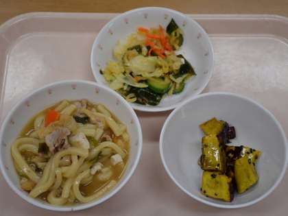 煮込みうどん 牛乳 大学芋 和風サラダ