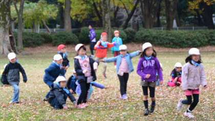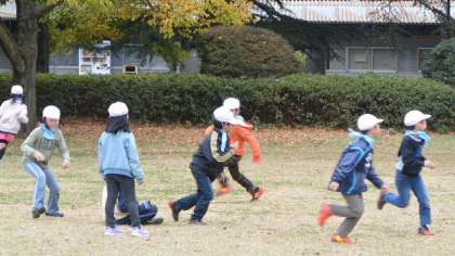 寒さを吹き飛ばすために、みんなで広い芝生の上でクラス遊びをして走り回りました。いっぱい走って体はぽかぽかです。