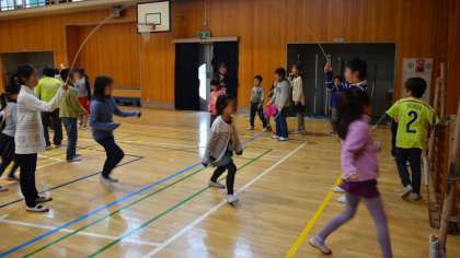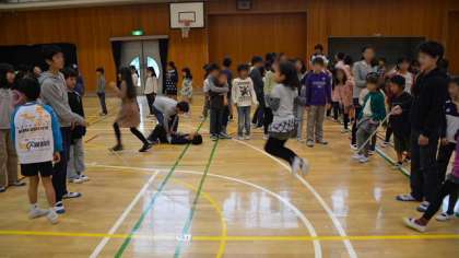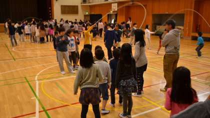 体育館割り当ての班は長なわ跳びをみんなでしました。なかなかうまく跳べない子に、優しく高学年児童が教えていました。