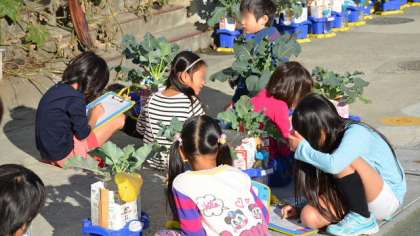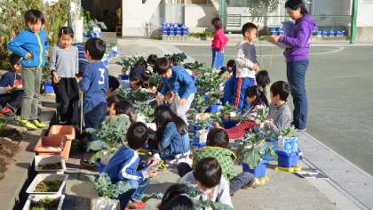 2年生は生活科の栽培活動として、1人一鉢、ブロッコリー作りに挑戦しています。今朝もまぶしい朝日を浴びながら、観察カードを手にして、自分の育てているブロッコリーのスケッチをしました。