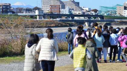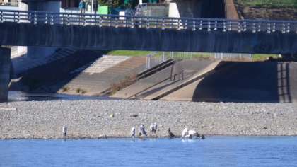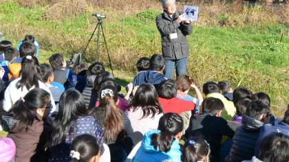 3日(水)、5年生が探鳥会を行いました。空は青空、風は北風ですっかり冬の天気です。多摩川の河原に出かけた5年生。この日は専門の講師の先生をお願いして説明をしていただきました。