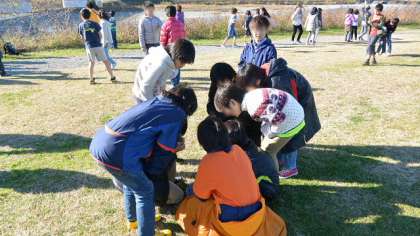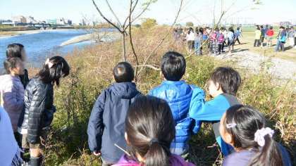 自然に詳しい講師の先生が、鳥のことだけでなく、多摩川の河原の様々な生き物について教えてくださいました。子どもたちはあちらこちらで新発見です。自然の見方が変わりますね。