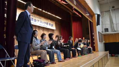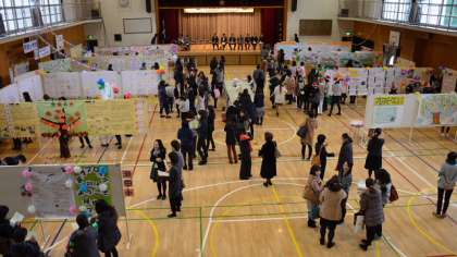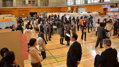 4日(木)、本校体育館で、「7ブロックPTA研修フェア」が開催されました。世田谷区の玉川地区の西側8つの小学校が合同で行う研修会です。各校がテーマを決めて取り組んだ研修の成果を、ブースで掲示資料を展示したり、ようすをビデオで紹介しあいました。10時、あいさつや来賓の皆さんの紹介など開会式を行い、研修フェアがスタートです。