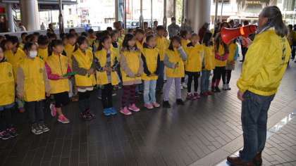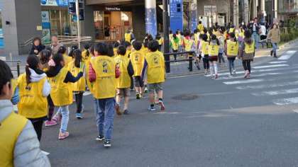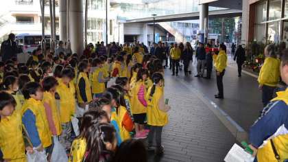 5日(金)、3年生がクリーンタウン作戦に参加しました。黄色のゼッケンとベストを身につけ二子玉川駅に向かいます。9時30分に駅前に集合した3年生。一般の参加者と一緒に話を聞いて、さあ作戦開始です。