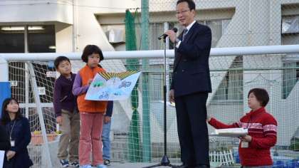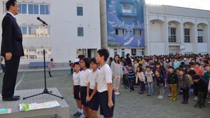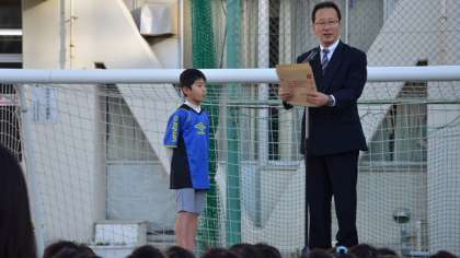 8日(月)、各地で大雪のニュースが届いていますが、東京は晴れ。しかし、今朝は冷え込んで真冬の到来を感じました。寒い中校庭で朝会です。校長講話では、寒いからといって、あまりにも厚着をすると、人間の持っている順応力が働かなくなってしまうので、ちょっと寒いかなといった程度に、できるだけ薄着を心がけるよう話しました。後半は交通安全ポスターに入選した4人の子どもたちの表彰と、音楽活動を継続していて賞をもらったこの表彰をしました。子どもたちは、寒さに負けずにしっかりと話を聞くことができました。