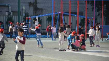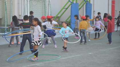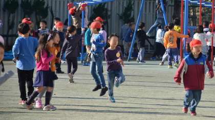 次に、班ごとに校庭で何をして遊ぶか相談した後、気温は低いものの、晴れ渡った空の下で、一緒に楽しく遊びました。