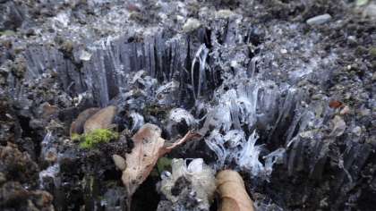 学校の東側の花壇には、こんなにきれいな霜柱が・・・。まさに自然がつくりだした造形美ですね。それにしても12月中旬でこの寒さとはびっくりです。