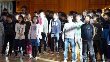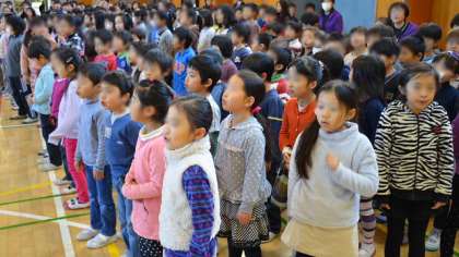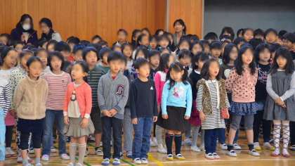 合唱団の歌の後は、全校で昨年のNHK合唱コンクールの課題曲「ふるさと」を歌いまいた。この歌は「今月の歌」として音楽の時間にも練習してきた歌です。子どもたちは大好きです。美しい歌声が体育館に響き渡りました。