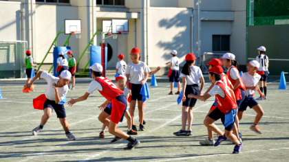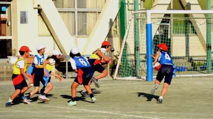 19日、6年生の体育のようすです。6年生は「フラッグ・フットボール」をしています。アメリカンフットボールのルールを基本にして、タックルの代わりに、腰につけたフラッグをとるというルールです。ボールもアメリカンフットボールで使用しているボールを小さくやわらかくしたボールを使っています。走る、投げる、そしてチームワークと動きの工夫も必要なゲームになっています。こちらもボールがやわらかく、役割分担もできるので、男女一緒に楽しんでできるゲームになっていて、6年生にはぴったりですね。