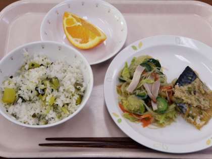 おいもとじゃこのごはん 牛乳 さばのねぎみそ焼き 春雨サラダ ネーブル