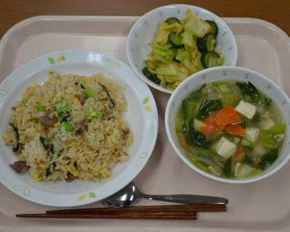 焼肉チャーハン 牛乳 豆腐と青菜のスープ 野菜の中華漬