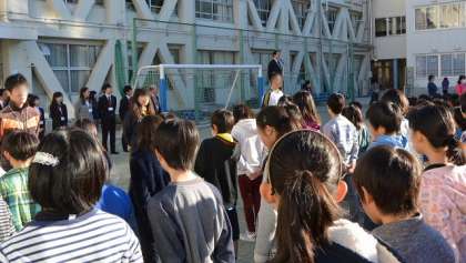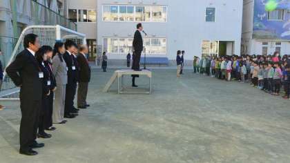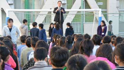 13日(火)朝会は校庭で行いました。校長講話では、1月17日が阪神淡路大震災から20年と言うこともあり、その頃の状況とそれ以来大地震対策が進んできたことを話しました。ニュースなどでも取り上げられる機会も多いと思いますので、家庭でも注目してみてください。この日は「教員採用前研修」で5人の研修生と指導者が来校していたので、その紹介もしました。子どもたちのあいさつや聞く態度がよいので、あいさつに立った研修生にほめてもらいました。
