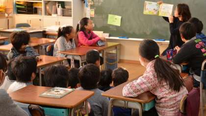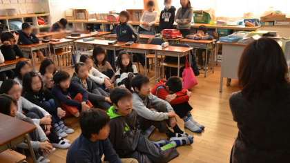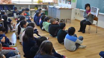 こちらは5年生の読み聞かせのようすです。すぐ近くで聞く子もあれば、少し距離をおいて見つめる子、顔をふせて音の世界にひたる子など高学年では子どもたちのようすもさまざまです。でも、いずれの子もおもいおもいに本の世界を楽しんでいます。読み聞かせをしてくださる保護者の方も、高学年の関心をひくような本を用意してくださっています。
