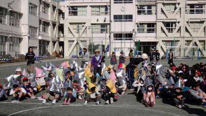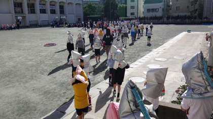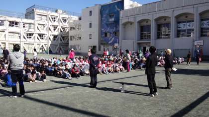 校庭に避難してきた子どもたちは、担任や専科教諭に先導されて、落ち着いて行動できました。今日はマイクを使わずに指示や話をしたのですが、おしゃべりしたりふざけたりする子もなく、しっかりできました。今日は合格、二重丸です。