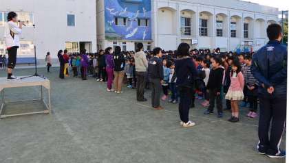 19日(月)、校庭で朝会を行いました。冬本番で朝は冷え込みが厳しくなってきましたが、子どもたちは寒さに負けず、厚い上着をぬいで、朝会開始時刻に間に合うように、校庭にきちんと整列できました。