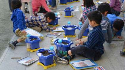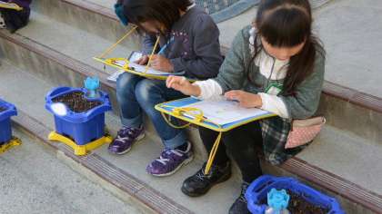 19日、1年生の生活科授業のようすです。1年生は夏までアサガオを育てた植木鉢に、チューリップの球根を植えて育てています。4月に新1年生をチューリップの花で迎えるためです。今日は生活科の学習で、その育ち具合を観察カードに描きました。みんな熱心に自分の育てている鉢を目の前に持ってきて、絵を描いたり、気がついたことを書きました。