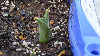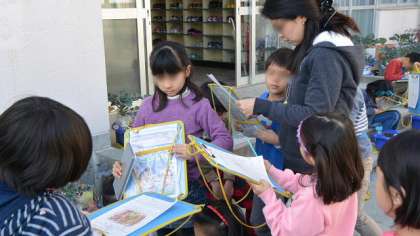 観察カードへの記入が終わった子が、担任のところにカードをもってきて見せています。「よく頑張って描いたね。」「もう少し気がついたことを書いてみない?」担任からのアドバイスをうけて頑張る子どもたちです。寒い日が続いていますが、チューリップの球根からはこんなふうに芽が出始めています。みんな一生懸命水やりをして育てているので、きっと4月には、色とりどりの美しい花を咲かせてくれるでしょう。楽しみですね。