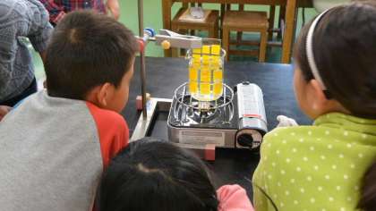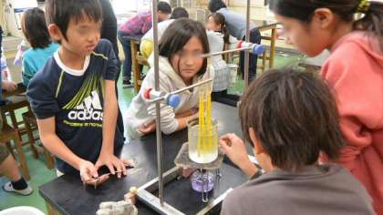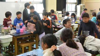 19日、4年生が、先週の研究授業の続きの学習をしました。先週来校して指導した他校の教員が、今日も学校に来て、先週子どもたちが研究授業の時にたてた実験計画に基づいて、実験をしました。各グループ調べる目的「水のあたたまり方」は同じですが、方法は自分たちが考えたもので、隣同士のグループでも実験方法が違います。多の班を気にしながらも、自分たちの考えを確かめるために興味津々で、実験に取り組んでいたのが印象的でした。
