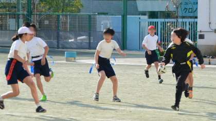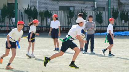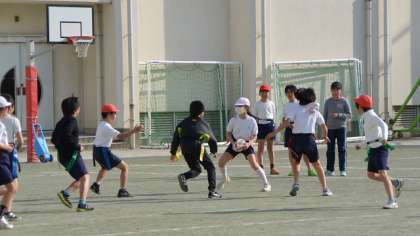 19日、5年生の体育の授業のようすです。タグ・ラグビーです。タックルの代わりに腰に付けたタグをとられると攻撃中断になりその場からリスタートです。ルールもすぐ覚えました。ラグビーボールより少し軽くやわらかいボールを使い、敵のディフェンスをかいくぐりながら、果敢に相手陣地を目指します。みんなそれぞれの役割を考えて、ゲームを楽しんでいました。