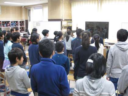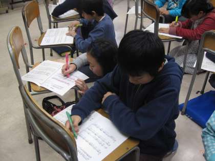 22日、今日学習した「飛行船」は,『6年生を送る会』で1年生から5年生に向けて歌う曲です。音楽専科教諭の歌声を聴きながら,楽譜の主旋律にマーカーで印をつけていきます。いつもソプラノが主旋律とは限りません。子どもたちの集中は高まります。楽譜ができあがったところで,みんなで気持ちをあわせて歌いました。