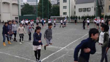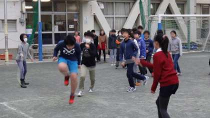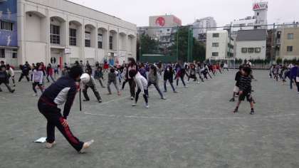 22日朝の体育朝会は5・6年です。長なわとび5分間で何人跳べるか競い合います。寒くどんより曇った空から、時折ぽつぽつと雨も降るようなコンディションでしたが、準備運動をしっかりしてみんながんばりました。