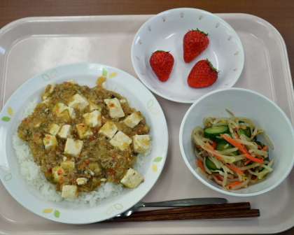 麻婆豆腐丼 牛乳 もやしのコチジャンかけ いちご