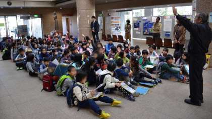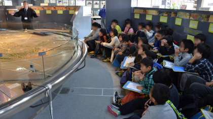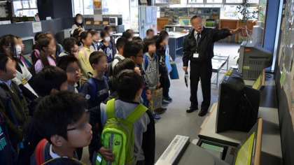 28日、4年生が教育センター移動教室に出かけました。年度当初の予定では10月6日に実施するはずだったのですが、なんと台風接近のため延期になっていたのです。いつもより少し早めに集合した4年生は、貸し切りバス2台に乗って、教育センターに向かいました。到着後すぐに、センターの先生方とご挨拶。1組と3組の半分、2組と3組の半分の2グループに分かれて、世田谷の郷土学習と天文学習を行いました。郷土学習では、2階にある郷土学習室で行い、最初に学習室の使い方を説明していただきました。