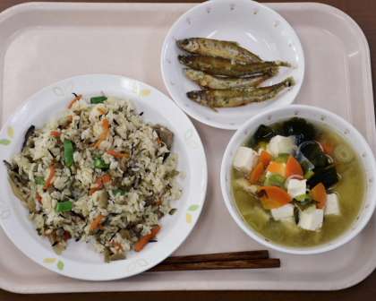 五目ごはん 牛乳 わかさぎの磯辺揚げ みそ汁