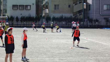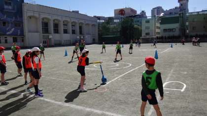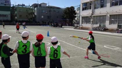 先日、ジャイアンツアカデミーの方に授業をしていただいたティーボール。野球型のゲームとして簡単にできるのですが、今日はさっそく4年生が体育でやっていました。みんな元気に声をかけあって、楽しそうにできていました。