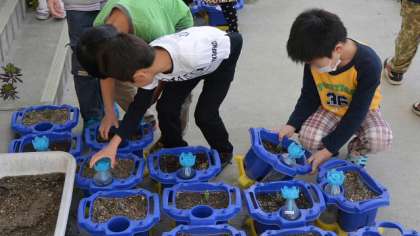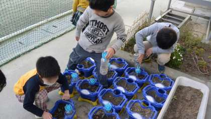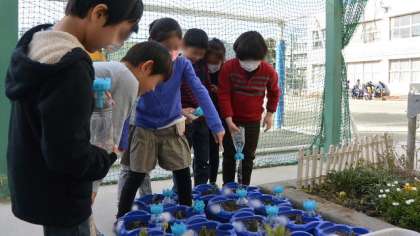 朝会終了後、1年生がチューリップに水やりをしていました。「ずいぶん伸びてきたね。何の色のチューリップが咲くかな?」と声をかけると、次々と自分のを見てほしいとお呼びがかかります。自分のチューリップが大きく育っている子も、まだ小さいけれども芽が出てきたばかりの子も、本当にいとおしそうに見守っていました。