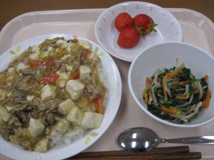 家常豆腐丼 牛乳 ナムル いちご