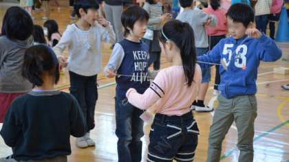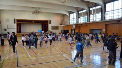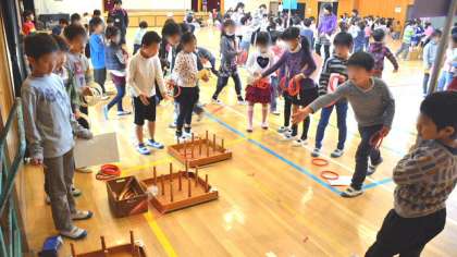 20日(金)3・4校時、1・2年生が交流遊びの時間を体育館でもちました。2年生は前回瀬田小学校の2年生を招いて同じように交流をしました。今回も2年生が遊びのコーナーを担当し、1年生がコーナーをまわって一緒に遊んだり教えてもらうという企画です。(写真:「ブンブンごま」「輪投げ」)