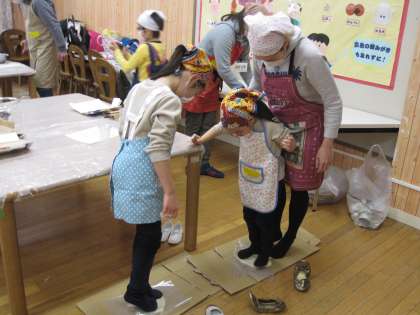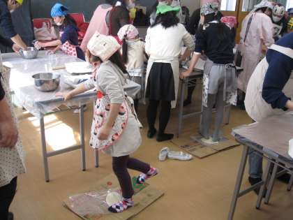 ビーニール袋に移して,足で踏む作業をします。たくさん踏むとコシがでます。子どもたちは,「おいしくなーれ♪おいしくなーれ!」と歌を歌いながらやっていました。