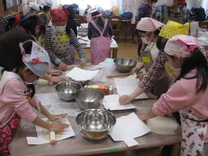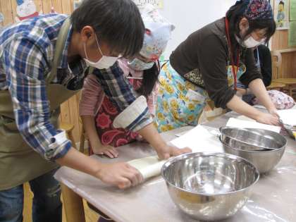 打ち粉をした台にのせ,めん棒でのばします。ひっくり返したり,向きを変えたり,いろいろな方向にのばしていきます。
