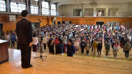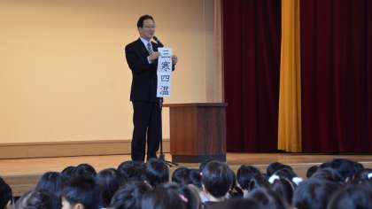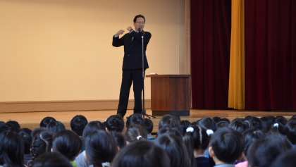 23日(月)朝会は、昨日の夜から降った雨で校庭がまだぬかるんでいたため、体育館で行いました。いつも朝会は、6年生あいさつ当番の元気な「おはようございます」の声から始まります。校長講話は、毎朝校門に立ってあいさつしていていて感じることを話しました。こちらから声をかける前に、自分からあいさつする子が増えていること。通りかかる大人の人も、こちらのあいさつに応えてくれる人が増えてきたことを話し、二子玉川の街が、みんなのあいさつがあふれる街になるとうれしいという話しです。次に、通勤途中で見たびっくりするような出来事について、身振りを加えて話し、その善し悪しは子どもたちの判断にまかせました。家庭で聞いてみてください。最後に、少しずつ春が近づいていることに気づいてほしいと思い、「三寒四温」の言葉の意味について話しました。