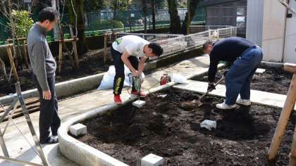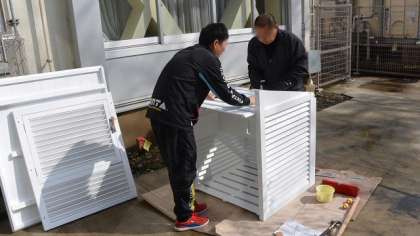 学校東側の北校舎と南校舎の間の中庭に、「百葉箱」を設置しました。昨年度校舎を増築した関係で、かつてあった百葉箱を撤去したままになっていましたが、設置場所がなかなか工面できず、納品されていた新品の百葉箱が設置できずにいました。先月、中庭の整備をして場所を確保したので、今日設置することになり、組み立てから土台作りまで本校主事が力をあわせて行いました。
