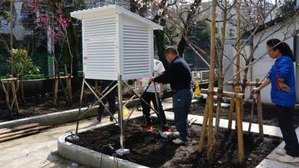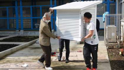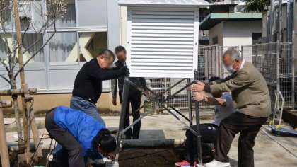 今日は天気もよく気温も上がって、作業は能率よく進み、昼前にいよいよ土台と脚の上に本体を設置するところまでいきました。事務主事と、ちょうど通りかかった新BOP事務局長さんにも手伝ってもらって、無事設置作業が終了しました。厳密な基準に照らすと設置場所としては不十分な場所なのですが、狭い本校の敷地を考えると、わりとよい場所に設置できたと思います。これから、中に温度計や湿度計、気圧計を据え付けて、気象観測に役立てます。