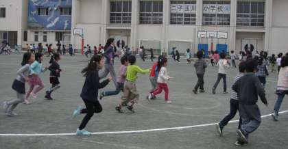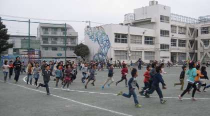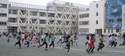 24日(火)朝、1・2年の体育朝会を校庭で行いました。持久走の2回目になります。みんなで3分間、音楽が流れる中、楽しく走ることができました。教員も一緒に気持ちよく走りました。
