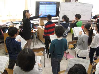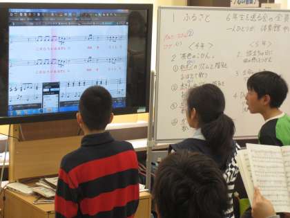 卒業式に歌う曲「旅立ちの日に」の練習をしています。今日のめあては,「曲の感じをつかむ」です。スコアーメーカーを効果的に活用して授業を進めています。ピアノの音とともに楽譜でどこを歌うか大型テレビに示してくれます。子どもたちは集中して取り組んでいました。