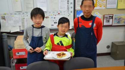 24日(火)、出張から帰ってきたところに、5年生の子が、家庭科の調理実習で作ったパンケーキをもってきてくれました。自分たちの班で作った分のおすそわけです。私が食べるのを心配そうに見つめる子どもたち。「外はパリっと中はもちもちしていておいしいよ」と言ったら、「よかった」といって喜んで戻っていきました。素直な気持ちがうれしいですね。