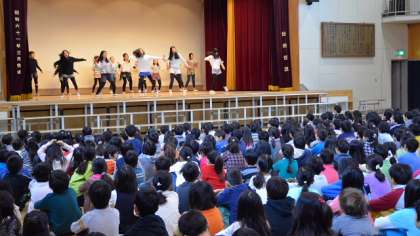 3日(火)朝、体育館に全校児童が集まって、ダンスクラブのクラブ発表を行い、クラブの時間に自分たちで振り付けをして練習してきたダンスを披露しました。前列の高学年のリードで、躍動感のあふれる動きに、息もぴったり合っていました。