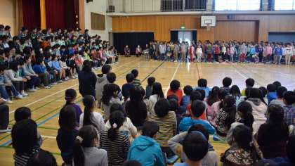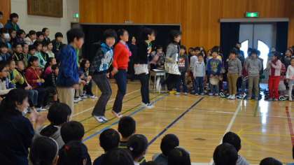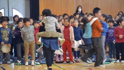 各学年の出し物がスタートしました。最初は1年生。6年生になわとびの二重跳びや、おんぶやだっこをお願いして、6年生が快く引き受けてくれました。