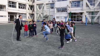 練習の後、クラスごとに5分間で何回跳べるか数えました。最高記録は2年生で270回以上跳べました。