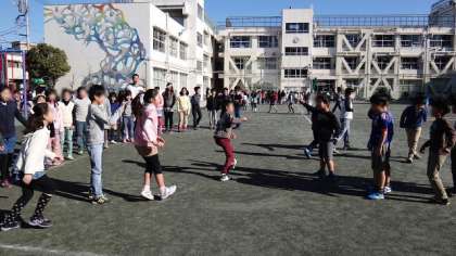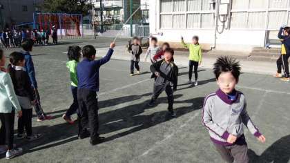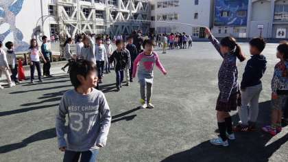 11日(水)今朝は、校庭の状態はあまりよくなかったのですが、天気がよかったので3・4年の体育朝会を行いました。昨日の1・2年と同様に、長なわ跳びです。体が縮こまってしまいそうな寒さでしたが、そこは元気な中学年。みんな元気に声をかけあって跳んでいました。